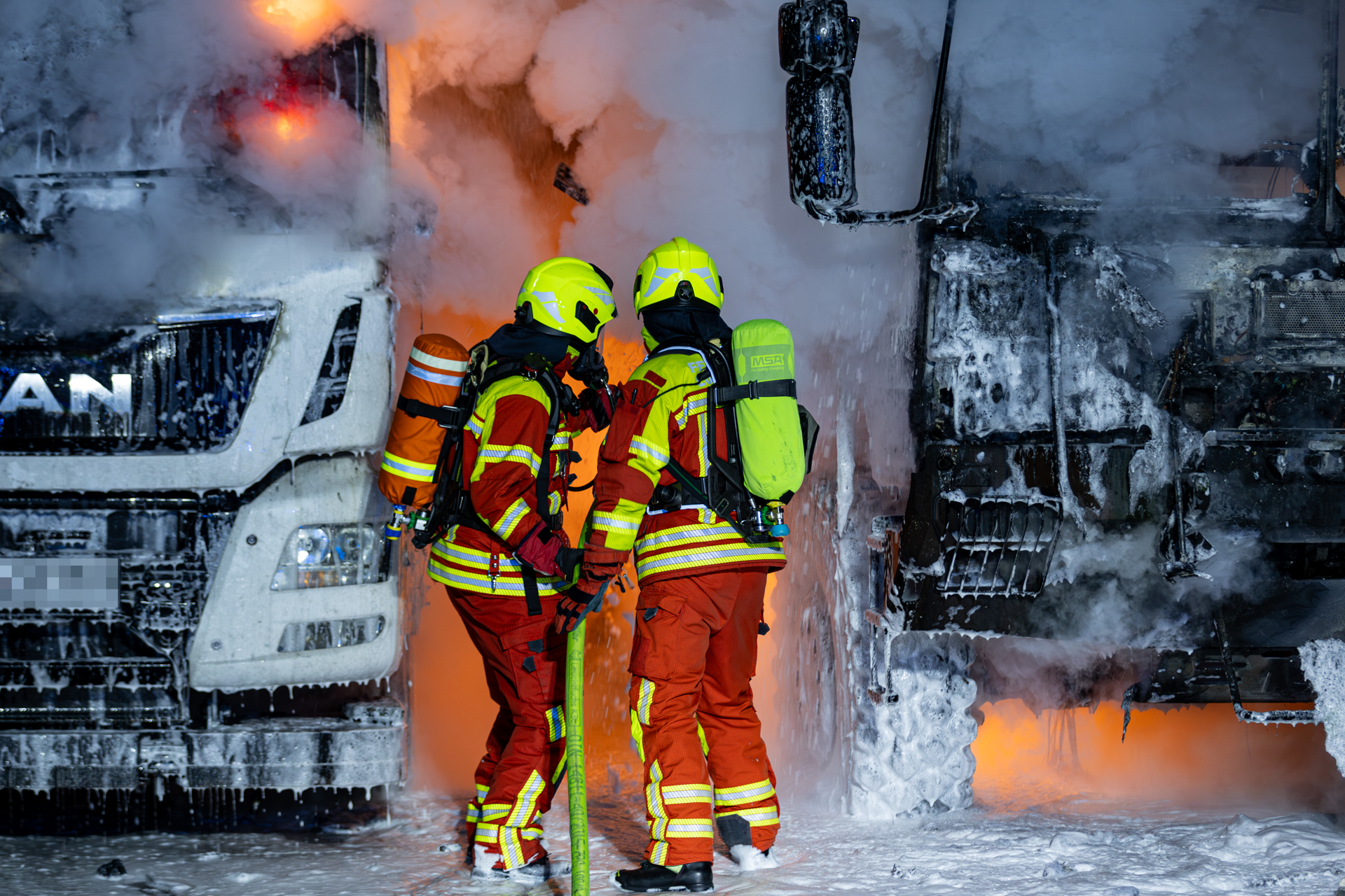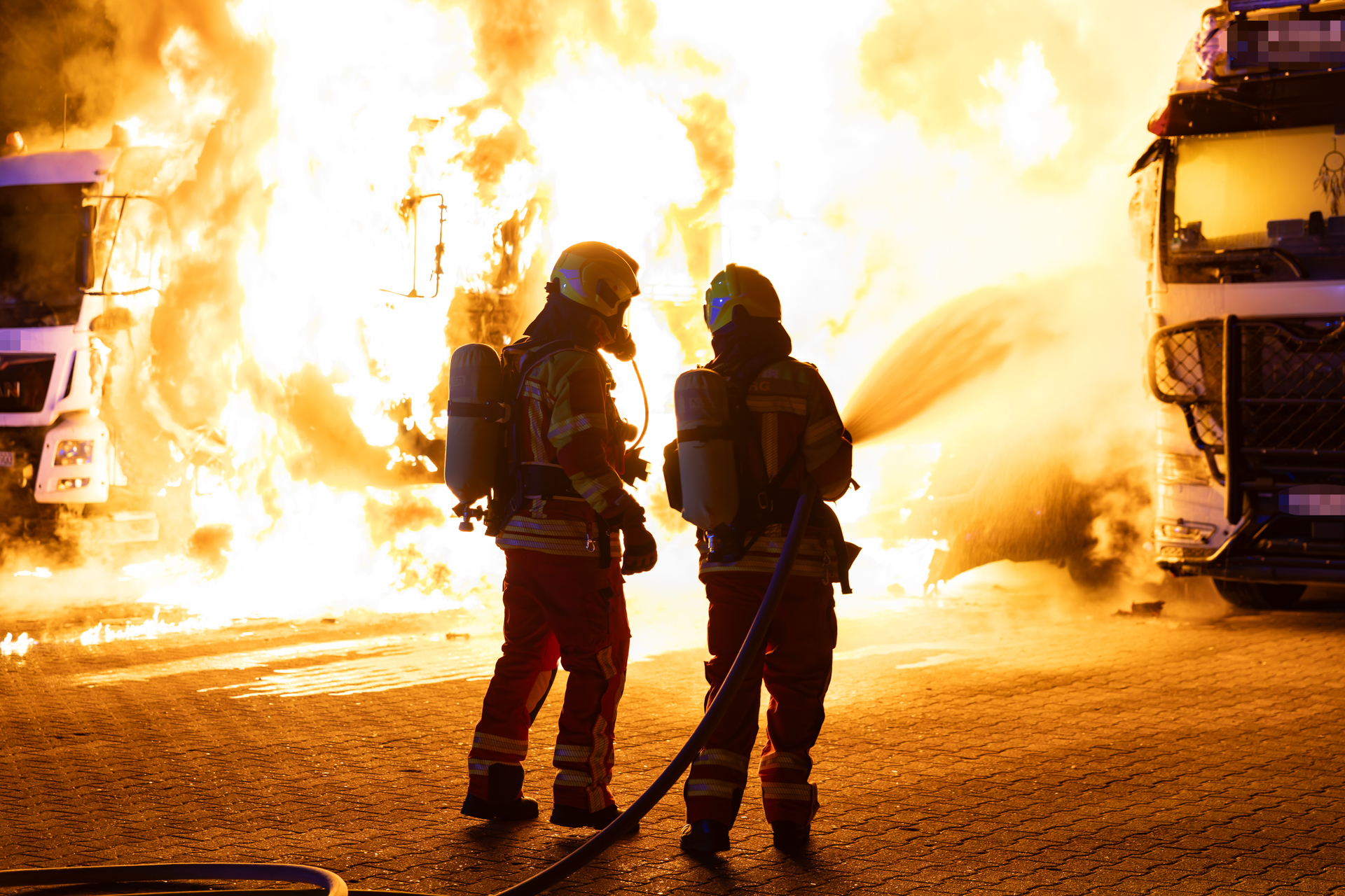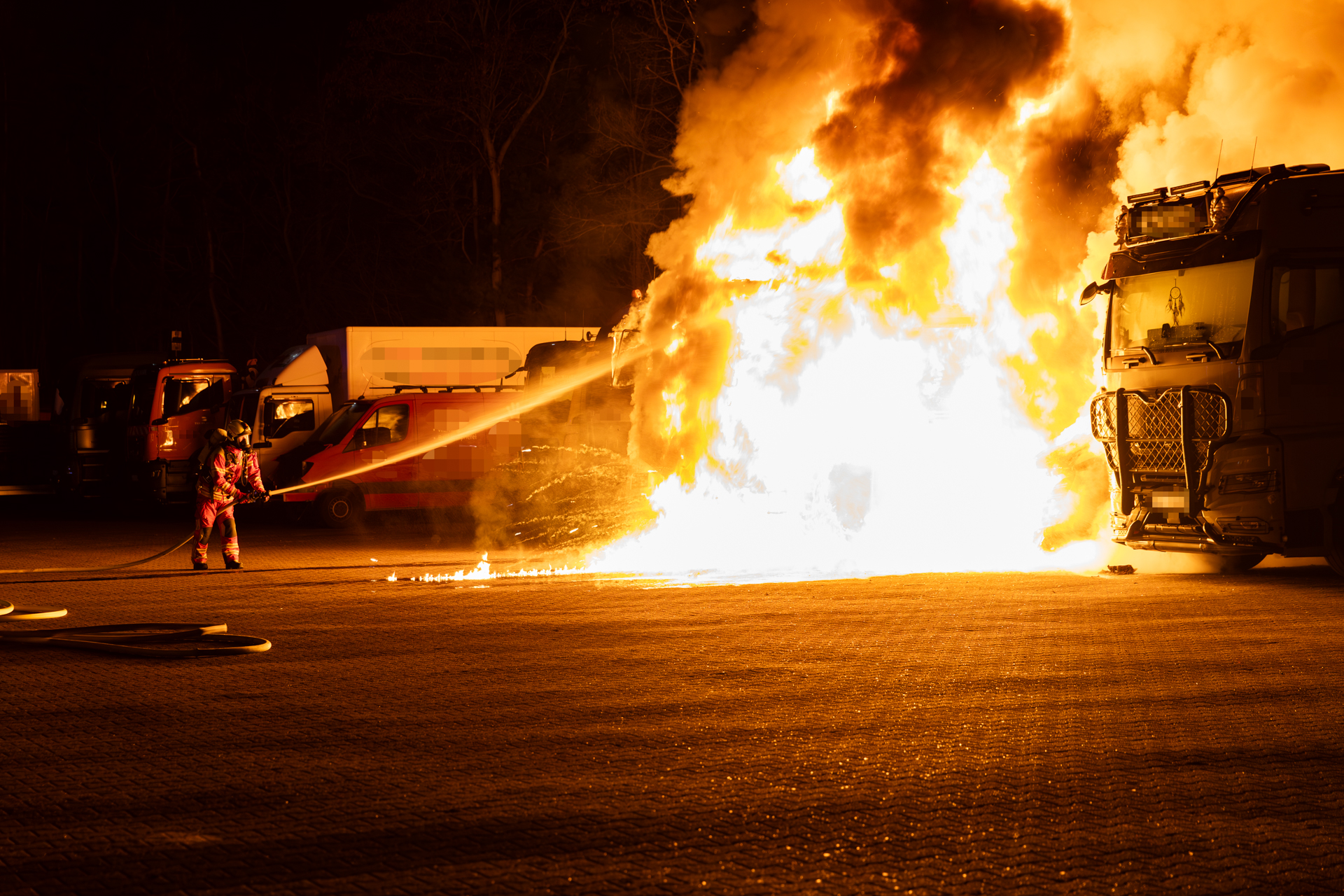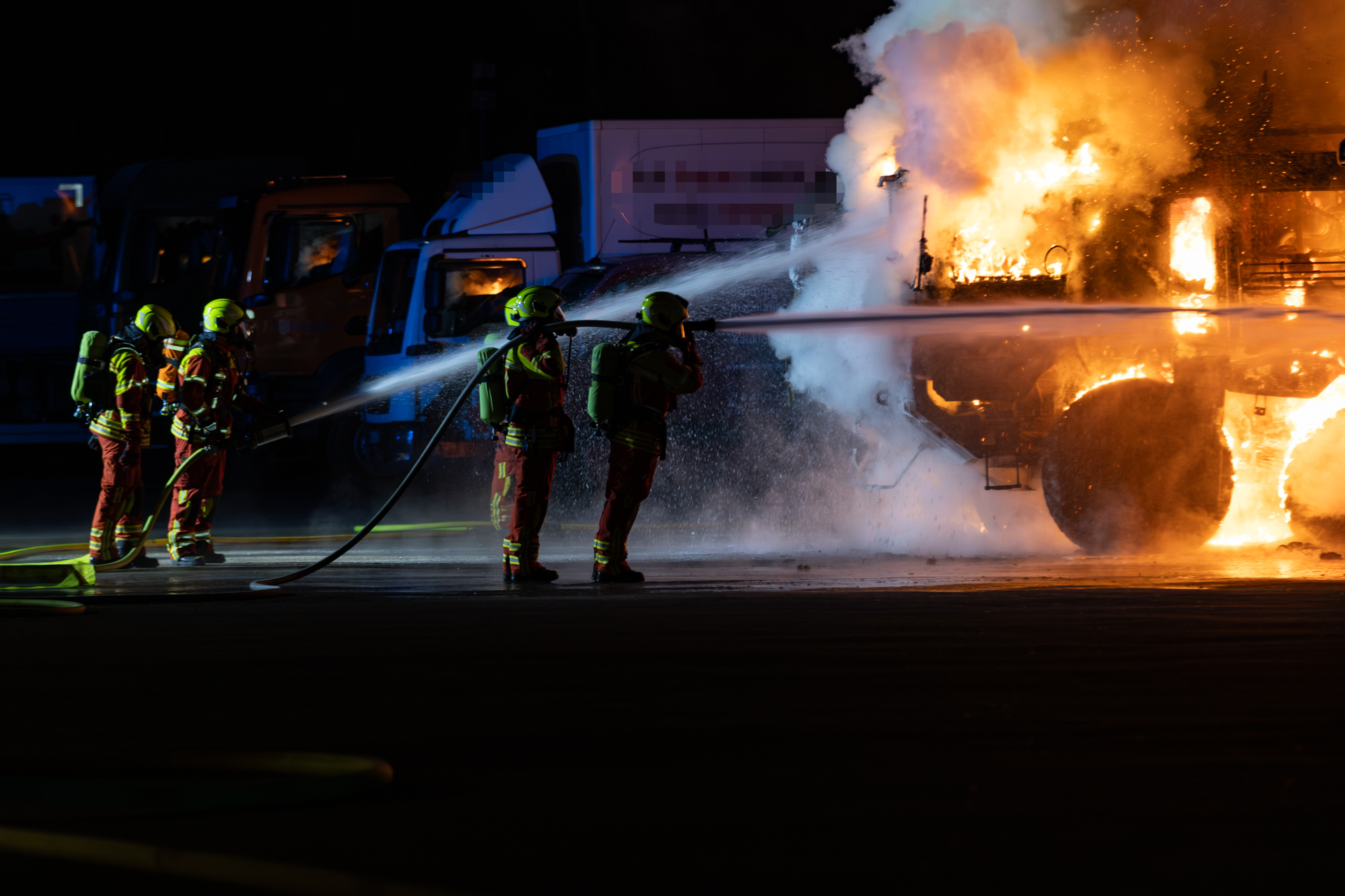 Umgehend rückten Kräfte in Richtung Hafen aus und trafen kurze Zeit später am Einsatzort ein. Noch während der Anfahrt konnte die Erstmeldung durch die Polizei bestätigt und eine Ausbreitung auf einen weiteren LKW festgestellt werden. Ein Spezial-LKW, welcher auf dem Gelände einer Nutzfahrzeug-Servicewerkstatt stand, brannte bereits in voller Ausdehnung. Da das Feuer inzwischen auf drei weitere Fahrzeuge übergegriffen hatte, wurde umgehend eine Riegelstellung aufgebaut. Einsatzkräfte gingen dabei unter Atemschutz mit zwei Strahlrohren vor und konnten so eine Ausbreitung auf weitere Fahrzeuge verhindern.