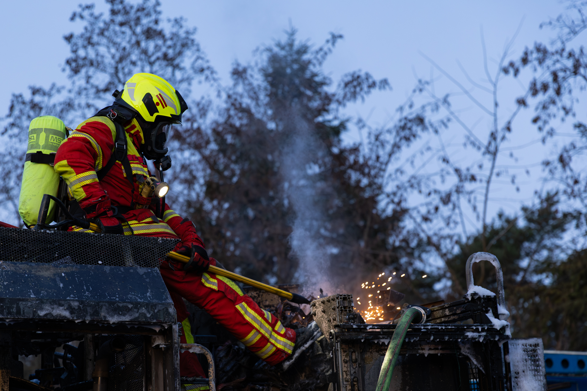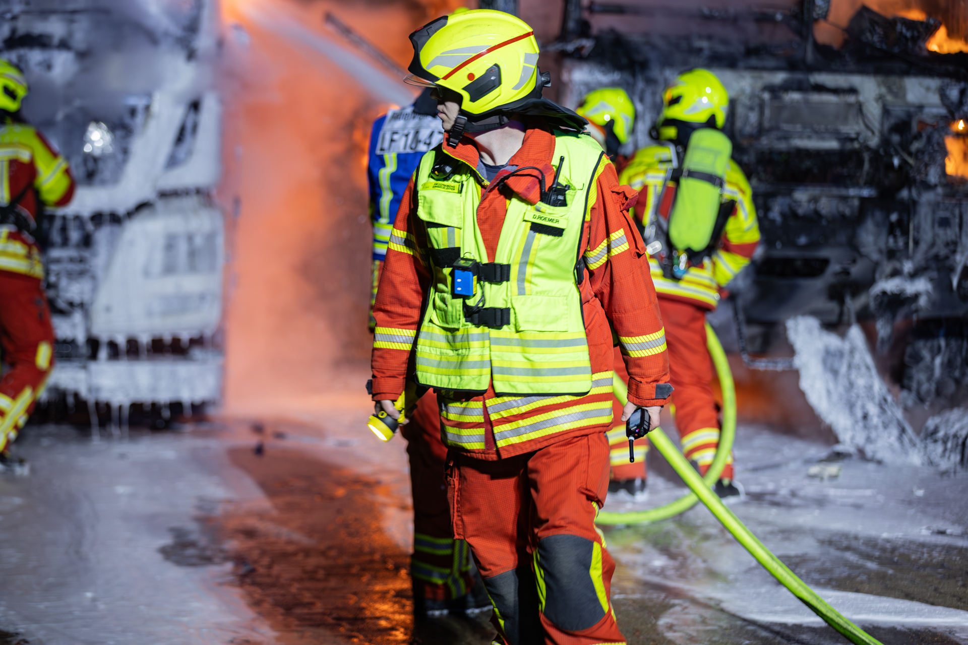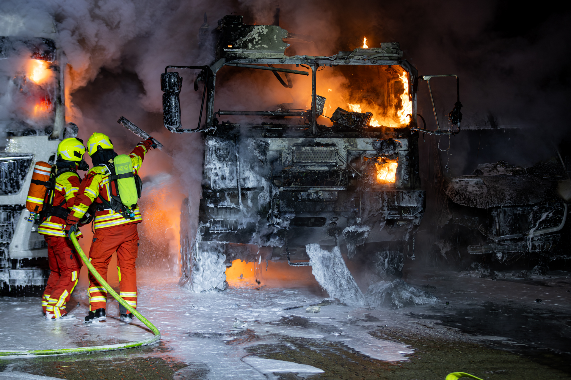 Die Nachlöscharbeiten wurden abschließend zu einer kräftezehrenden und personalintensiven Arbeit. Kurzschlüsse an den Fahrzeugbatterien des betroffenen Spezialfahrzeuges verursachten immer wieder Funken und Flammen, die betroffenen Bereiche waren jedoch durch die starken Beschädigungen nur schwer zugänglich.