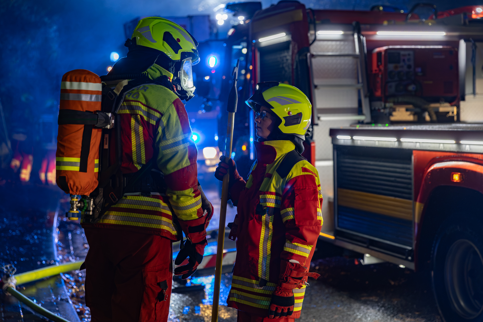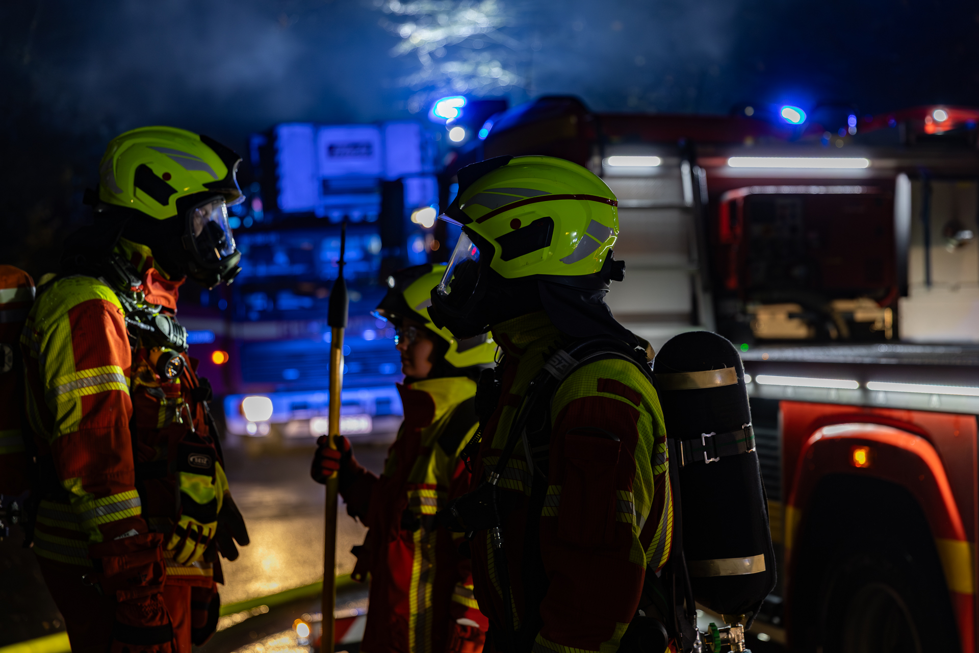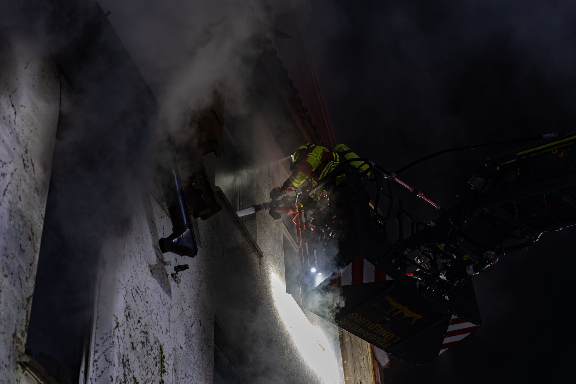 Das Feuer konnte so schnell unter Kontrolle gebracht werden und die Nachlöscharbeiten begannen. Aufgrund der Gebäudestruktur gestalteten sich die Nachlöscharbeiten sehr aufwendig und zeitintensiv. Insgesamt waren 7 Trupps unter Atemschutz mit 3 Strahlrohren in der Innenbrandbekämpfung im Einsatz.